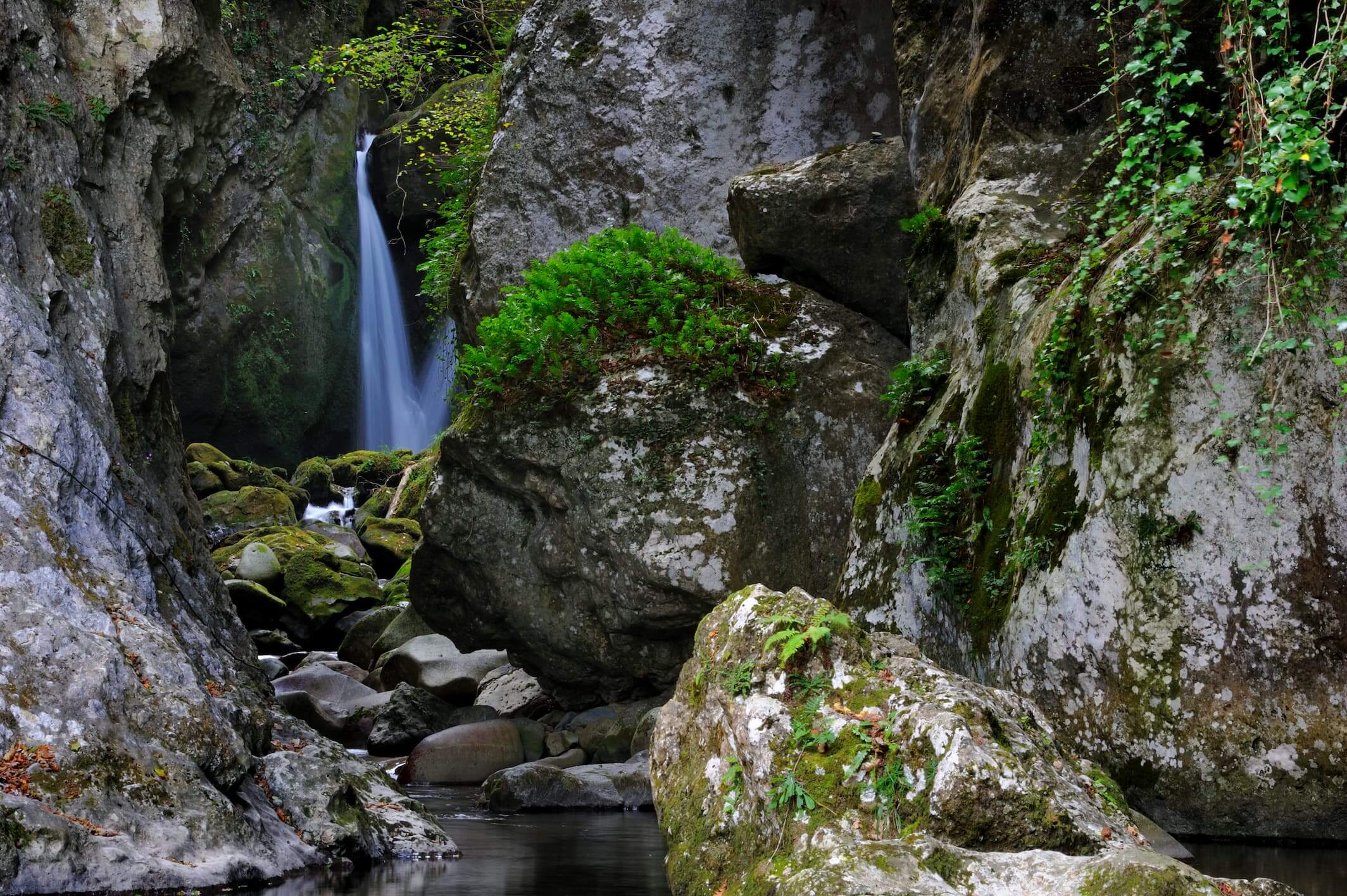 Une arche, creusée par l’eau dans un énorme bloc de calcaire, encadre l’ourse de Ferrère qui plonge en cascade. Un coin idéal pour échapper à la chaleur estivale.